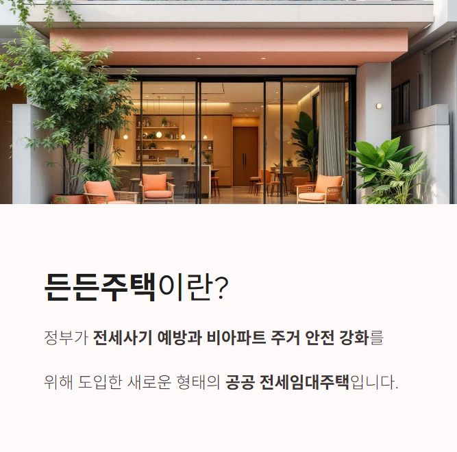 든든주택은 정부가 전세사기 예방과 비아파트 주거 안전 강화를 위해 도입한 새로운 형태의 공공 전세임대주택입니다.