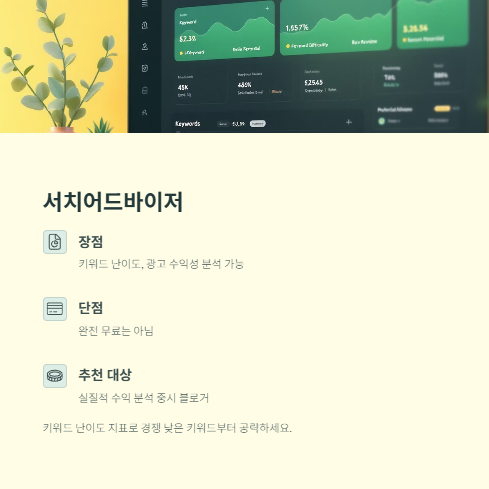 • 장점: 국내 키워드의 난이도, 광고 수익성 분석 가능