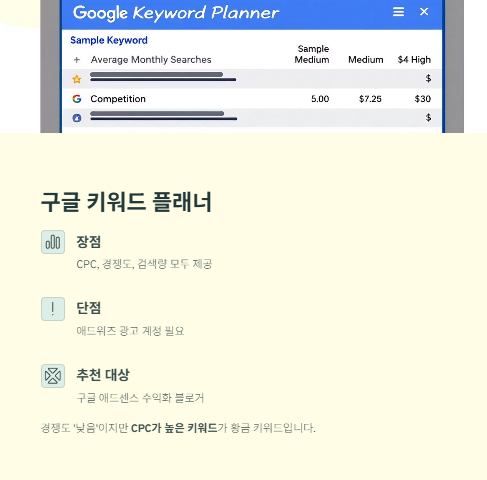 • 장점: CPC, 경쟁도, 검색량 제공