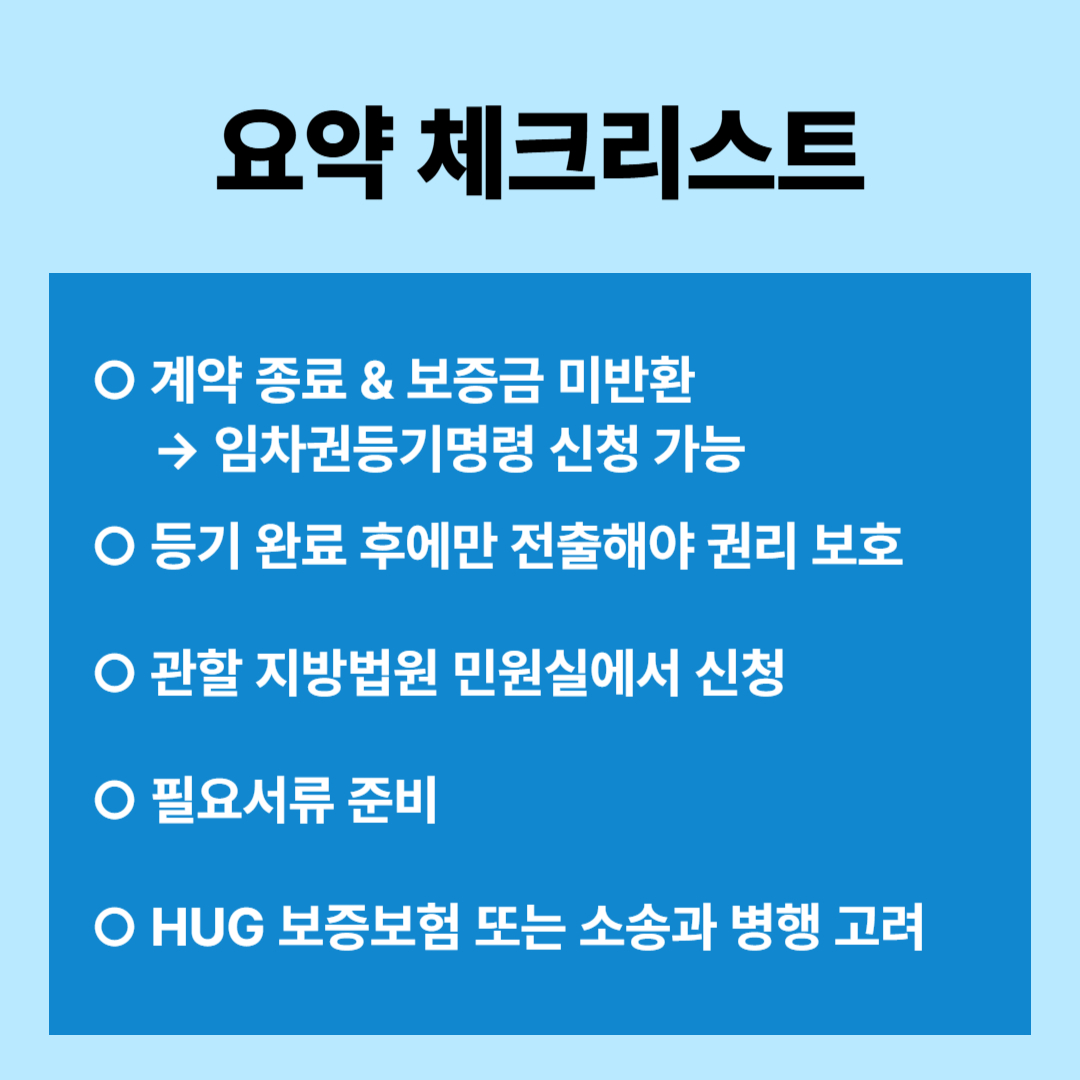 • 임차권등기명령은 채권 회수를 보장하는 수단이 아님 → 소송이나 HUG 보증보험과 병행 고려