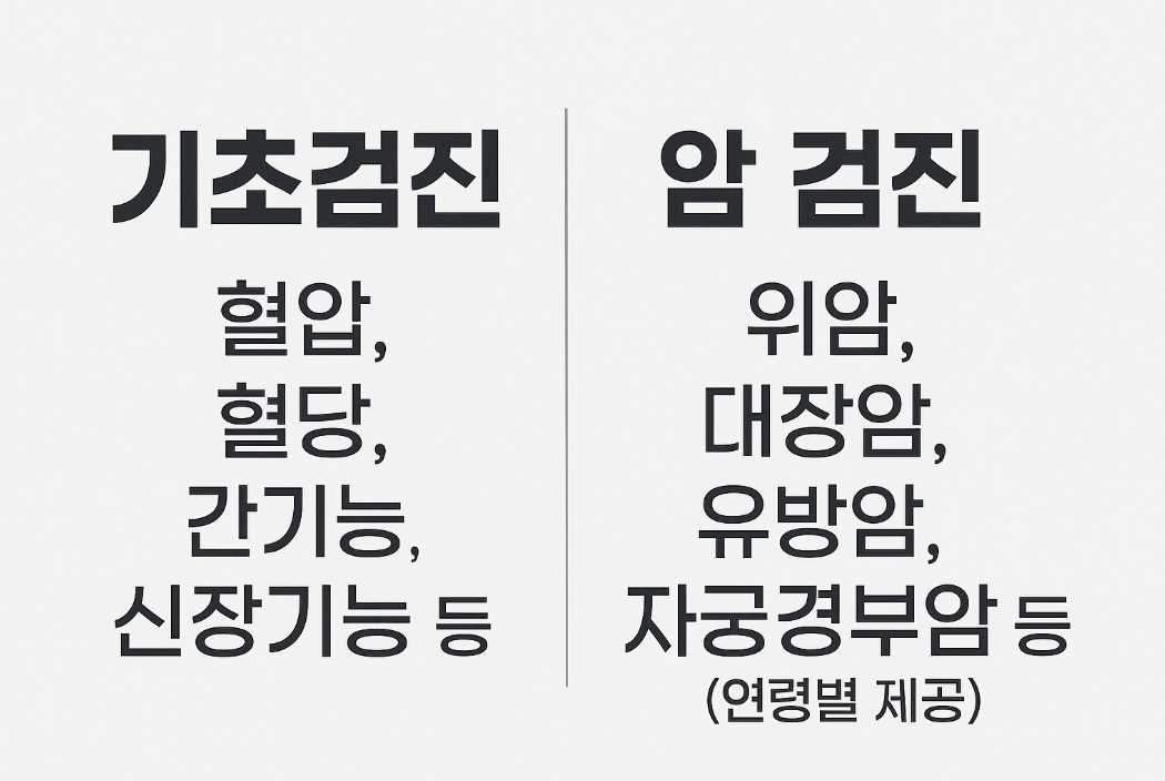 - 암 검진: 위암, 대장암, 유방암, 자궁경부암 등 (연령별 제공)
