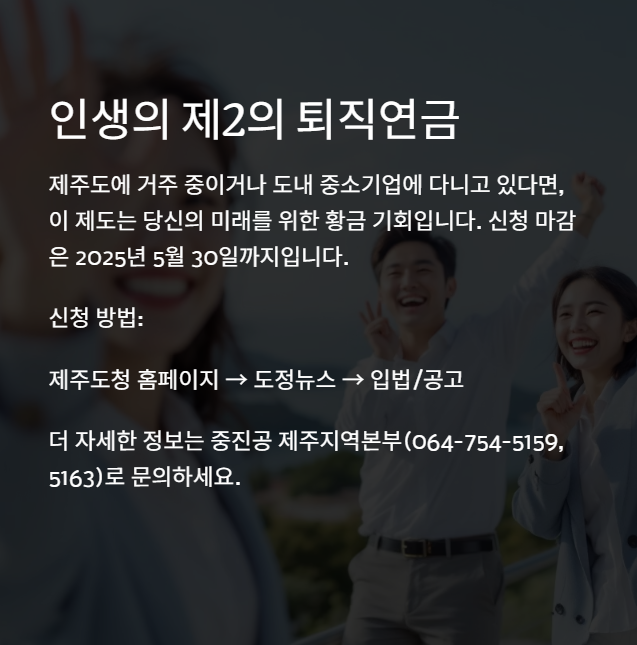 제주도에 거주 중이거나 도내 중소기업에 다니고 있다면, 이 제도는 인생의 제2의 퇴직연금이 될 수 있습니다. 신청 마감은 2025년 5월 30일까지!