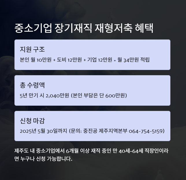 제주도에 거주 중이거나 도내 중소기업에 다니고 있다면, 이 제도는 인생의 제2의 퇴직연금이 될 수 있습니다. 신청 마감은 2025년 5월 30일까지!