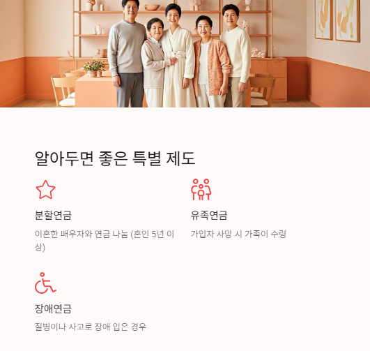 - 분할연금: 이혼한 배우자와 연금을 나눠 받는 제도 (혼인 기간 5년 이상, 혼인 중 가입한 연금만 해당)