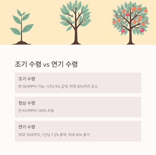 • 만 58세부터 수령 가능하지만, 1년 앞당길 때마다 6% 감액, 최대 30%까지 줄어듭니다.