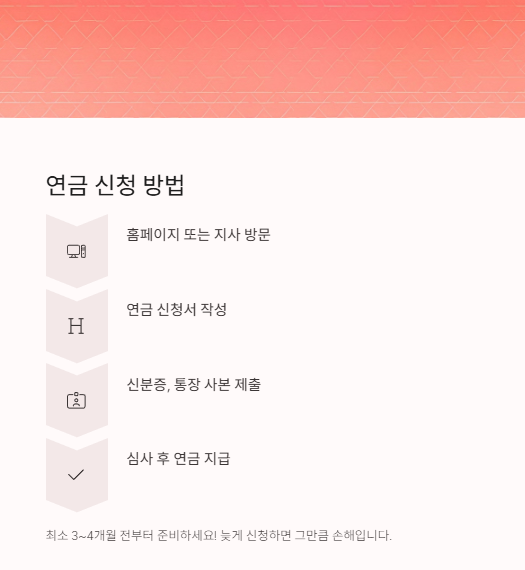 주의하실 점은, 최소 3~4개월 전부터 신청 준비를 하셔야 한다는 것입니다! 늦게 신청하면 그 기간만큼 연금이 지급되지 않기 때문에 손해가 큽니다.