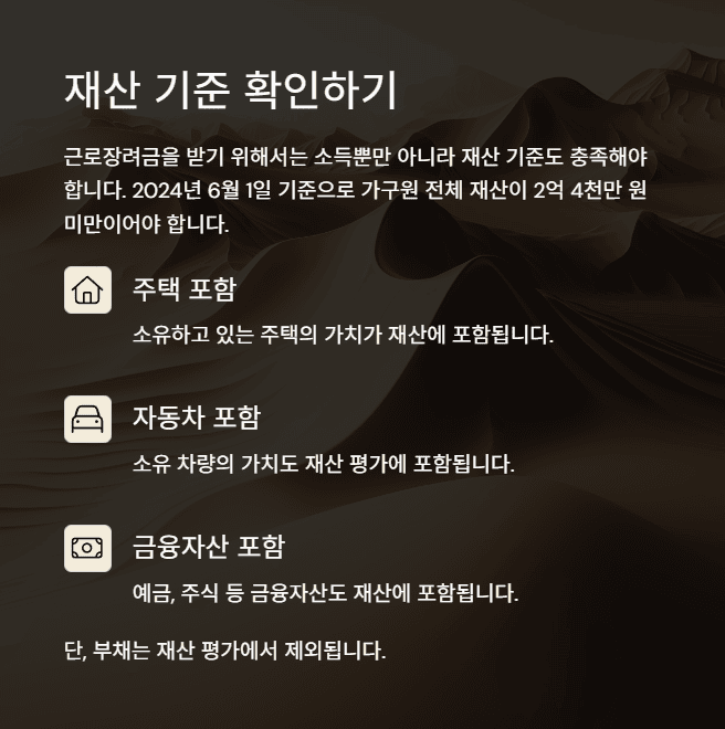 재산 기준: 2024년 6월 1일 기준 가구원 전체 재산이 2억 4천만 원 미만이어야 하며, 재산에는 주택, 자동차, 금융자산 등이 포함됩니다. 부채는 제외됩니다.