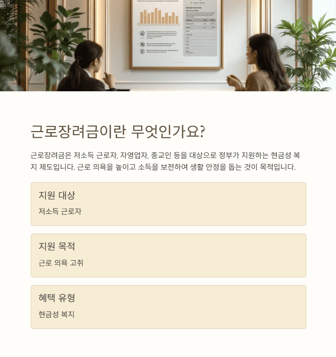 근로장려금은 저소득 근로자, 자영업자, 종교인 등을 대상으로 정부가 지원하는 현금성 복지 제도입니다. 근로 의욕을 높이고 소득을 보전하여 생활 안정을 돕는 것이 목적입니다.