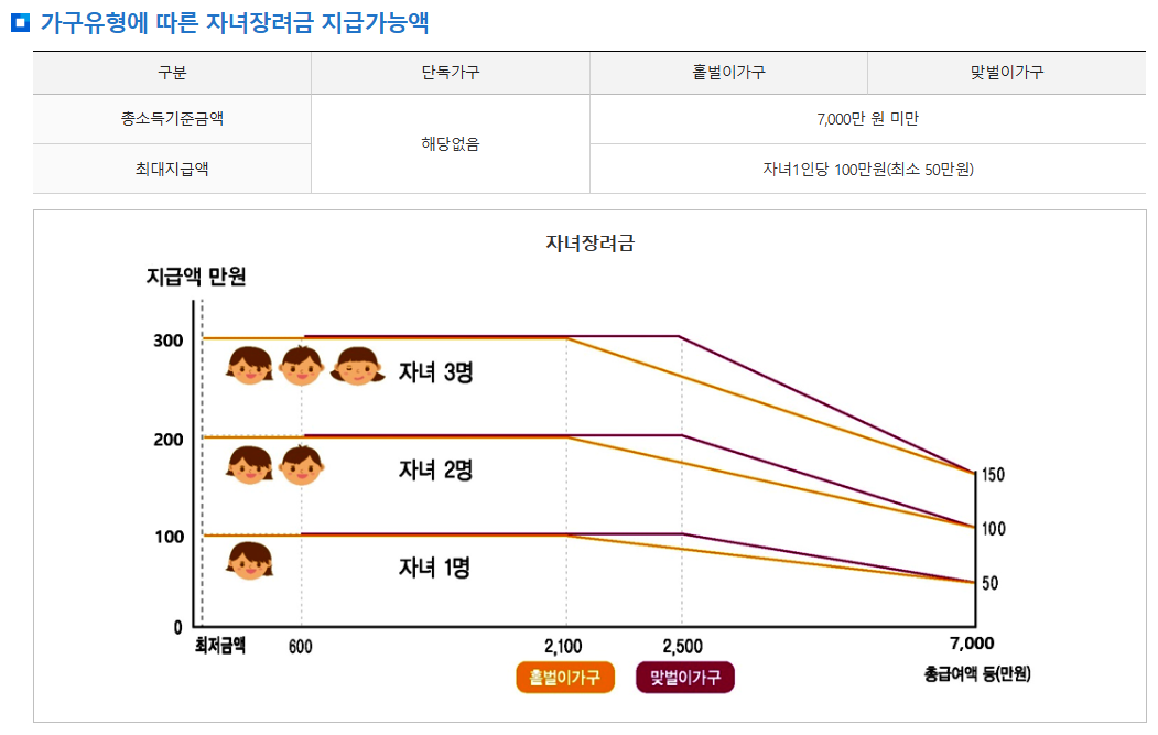 - 자녀 3명: 최대 300만 원 → 총소득이 7,000만 원에 가까워지면 50만 원 수준까지 감소