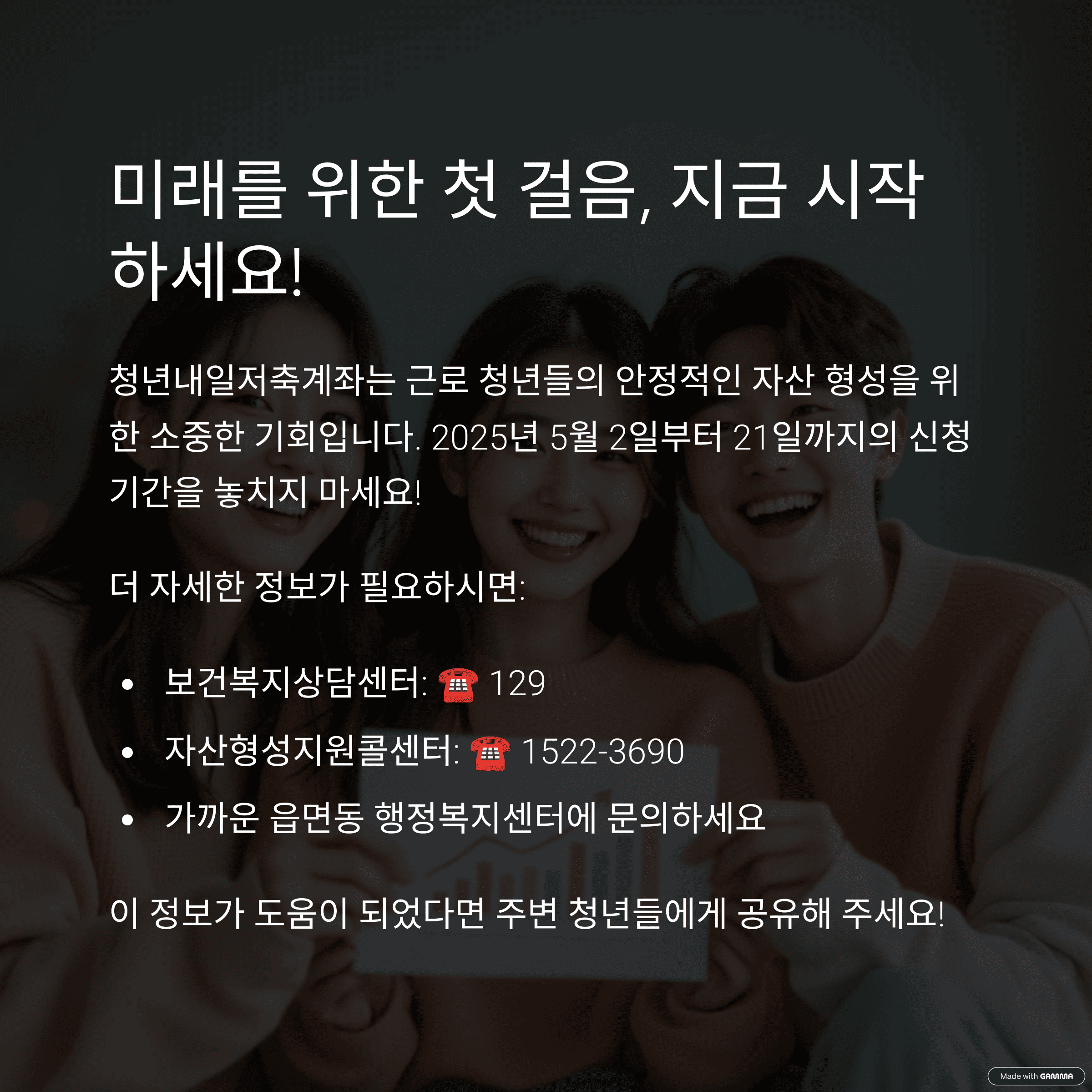 청년내일저축계좌는 청년의 미래를 위한 자산 형성 기회입니다.