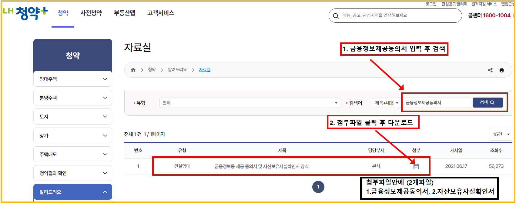 4. 자료실로 이동 되면 검색창에 금융정보제공동의서 검색