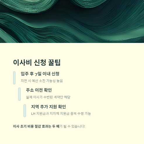 중요 포인트는 이사 완료 후 즉시 신청해야 한다는 점입니다. 지연되면 예산이 소진되거나 거절될 수 있습니다.